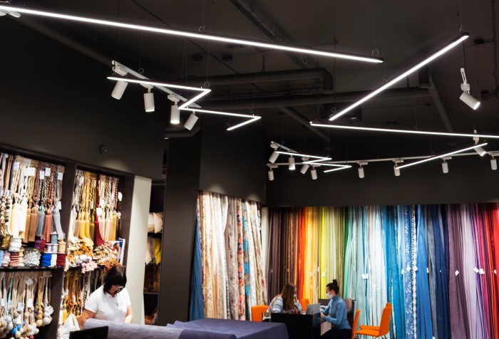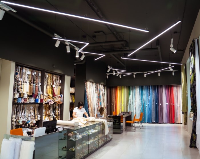 Описание объема работ: проект освещения, включая светодизайн и светотехнический расчет для салона тканей, штор и аксессуаров «Фактура», торгового зала, тамбура, швейного цеха, кабинета персонала, витрины.