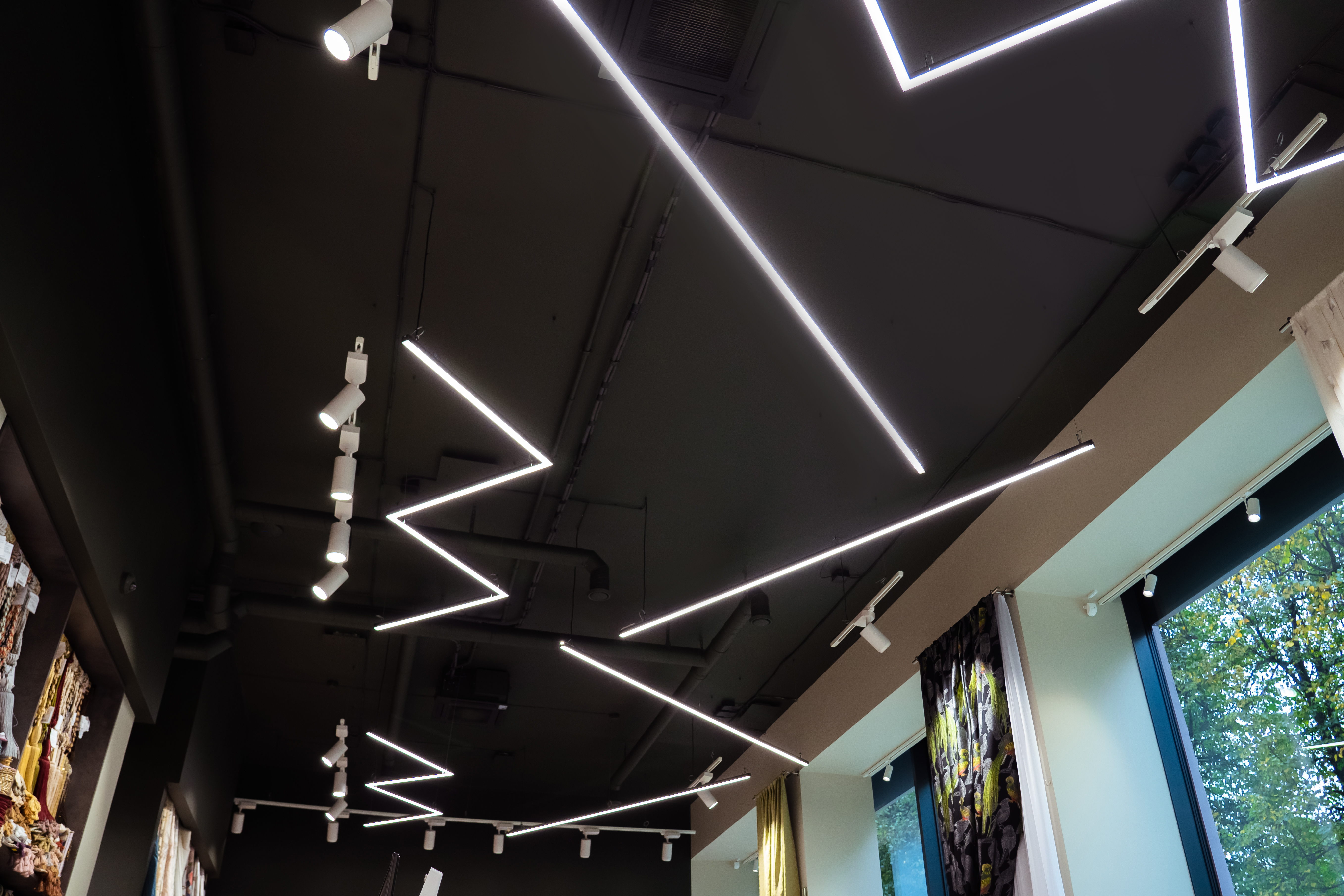 Решение: дизайнерские линейные светильники в виде комбинации прямых линий и зигзагов с использованием алюминиевого профиля Topmet Light Vario 30.