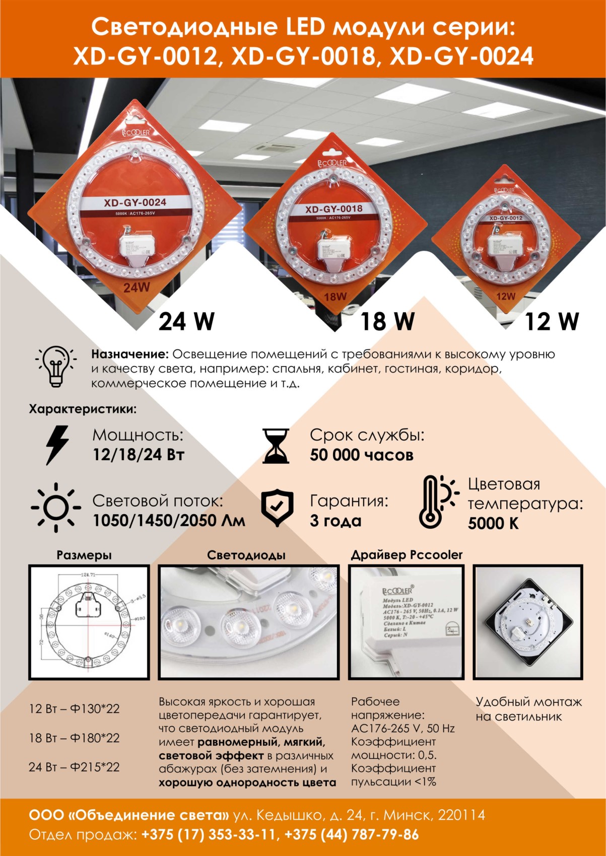 Светодиодный модуль Pccooler XD-GY-0012 - это устройство используемое в качестве источника света (так же называемый "светодиодный кластер"). LED модуль представляет собой электромонтажную плату с установленным на ней светодиодами. Данный световой модуль характеризуется отличными светотехническими характеристиками и однородностью света, длительным сроком службы, а также универсальностью применения. Идеально подходит для потолочных светильников, для замены устаревших ламп.