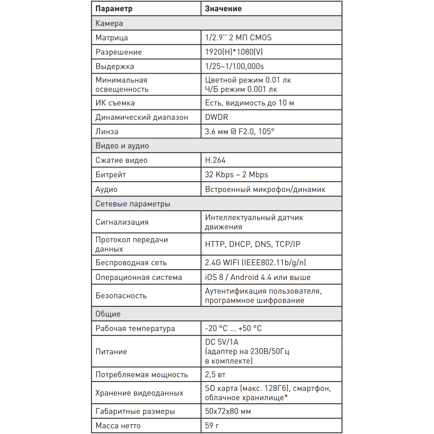 Питание камеры — 5В/1А DC. В комплекте адаптер для использования камеры в однофазных цепях переменного тока номинальным напряжением 230 В частотой 50 Гц. Для работы камеры необходимо наличие беспроводной сети Wi-Fi с частотой 2,4 ГГц и выходом в сеть Интернет. Управление камерой осуществляется с любого устройства на базе операционной системы Android 4.4 / IOS 8.0 или выше. Для управления необходимо установить приложение EKF Connect Home. Камеры соответствуют требованиям ТР ТС 004/2011, ТР ТС 020/2011 и ТР ТС 037/2016.