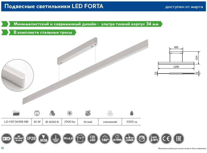• Ультратонкий корпус из алюминия (всего 34мм) гарантирует прочность и безупречный внешний вид светильника на долгие годы.