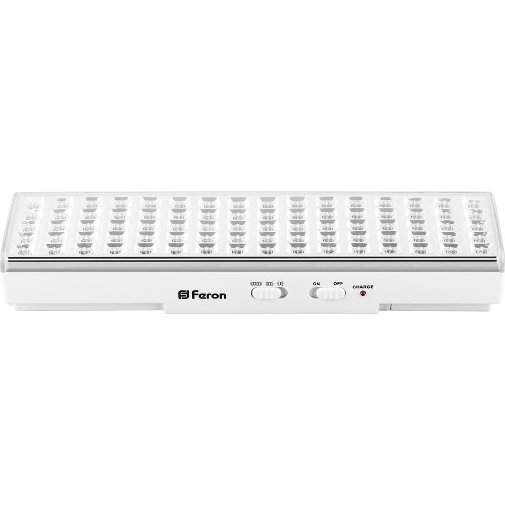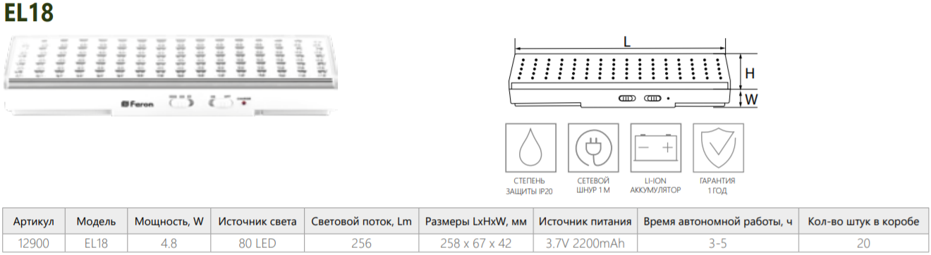 EL18 - аккумуляторный светильник Feron со светодиодным источником света, оснащенный встроенным незаменяемым литий-ионным аккумулятором с возможностью его подзарядки. Также светильник оснащен встроенным в корпус сетевым шнуром с вилкой для удобного подключения к сети электрического питания 230В/50Гц. Возможен вариант использования в качестве аварийного освещения, при совместном использовании с необходимыми наклейками.