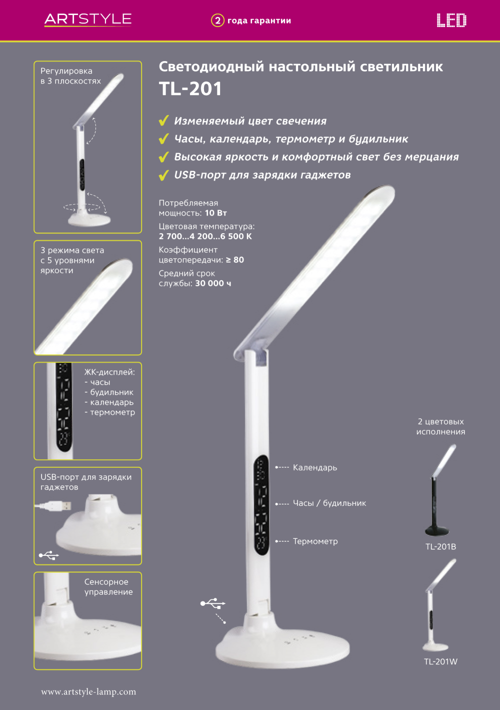 TL-201 дает мягкое, приятное освещение, безопасное для зрения даже при длительной концентрации. При этом яркость света выбираете вы сами с помощью пятиуровневой регулировки удобно установить комфортный режим света от теплого (3000К) до холодного (6500К). Светильник оснащен LED-дисплеем высокой четкости, так что вы всегда будете осведомлены о времени, дате и температуре окружающего воздуха. При этом, он может использоваться и как USB-зарядка для ваших устройств. Надёжно и удобно.