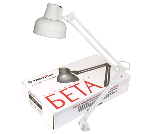 Лампа в комплект не входит и приобретается отдельно. Источник света светильника "Бета" - лампа накаливания мощностью 60Вт и цоколем Е27 (не входит в комплект). Допускается установка светодиодной лампы мощностью до 8Вт. Крепления к торцам столешниц, полок стеллажей и прочим аналогичным поверхностям осуществляется с помощью струбцины, входящей в комплект поставки.