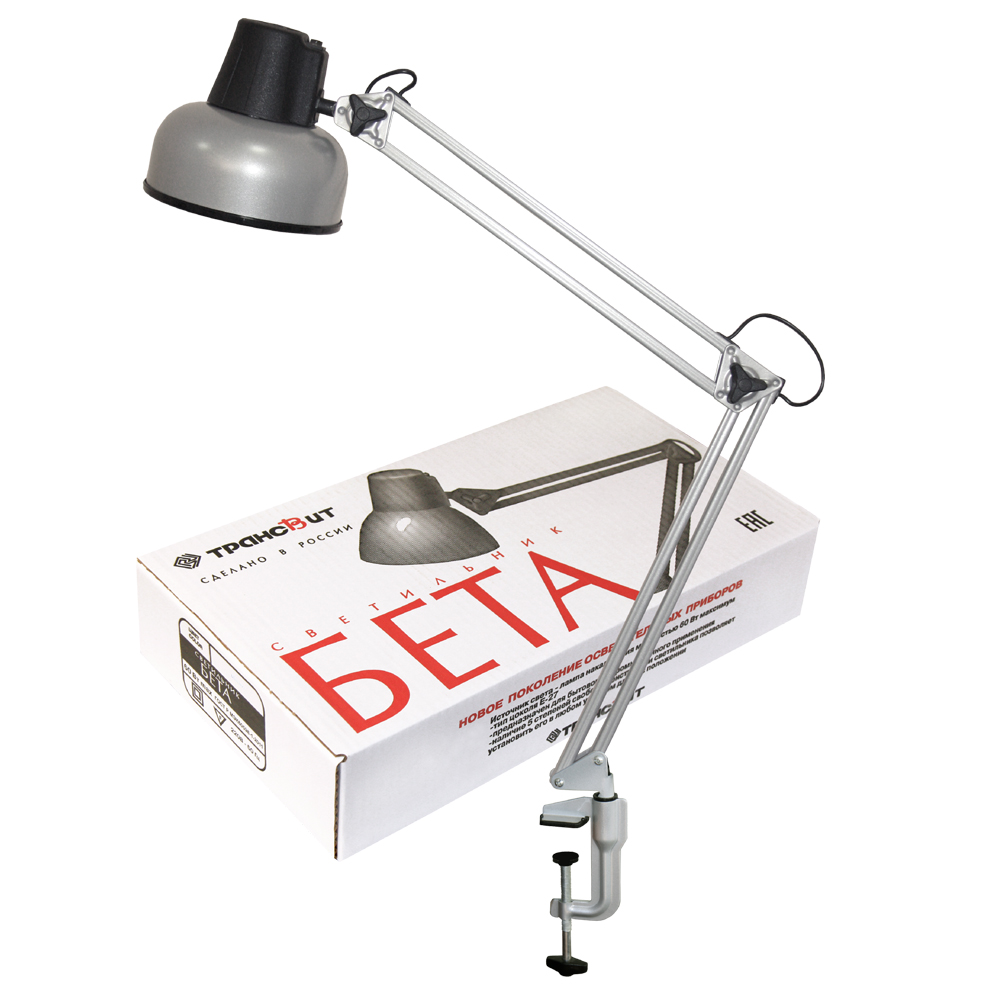 Лампа в комплект не входит и приобретается отдельно. Источник света светильника "Бета" - лампа накаливания мощностью 60Вт и цоколем Е27 (не входит в комплект). Допускается установка светодиодной лампы мощностью до 8Вт. Крепления к торцам столешниц, полок стеллажей и прочим аналогичным поверхностям осуществляется с помощью струбцины, входящей в комплект поставки.