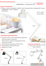 Настольные светильники серии «Бета» используются для настольного освещения в офисах и жилых помещениях, для освещения рабочих зон промышленных предприятий, цехов, конвейерных линий, для освещения гаражей, для освещения мастерских.