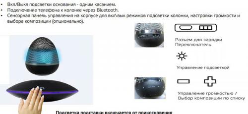 Ударопрочный,Декоративный,Сенсорное управление,Изменение режима освещения,Питание через встроенный аккумулятор,Зарядка аккумулятора,Эффект левитации,Ночник,Беспроводное подключение,AUX разъем