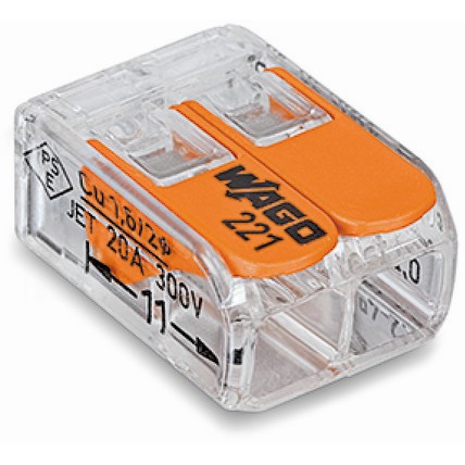 Клемма WAGO 221-413 на 2 контакта, предназначенная для подключения любых типов медных проводников: моножильных и многопроволочных.
