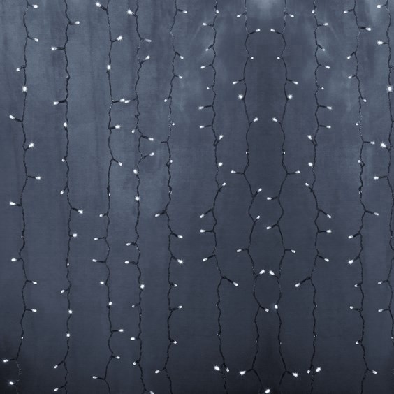 Гирлянда "Светодиодный Дождь", от Neon Night, типа "Занавес", серии Original, с прозрачным проводом из ПВХ. Данная гирлянда имеет белый цвет свечения светодиодов. Представляет собой гибкий горизонтальный шнур-шину (2м), к которому через определенные промежутки крепятся вертикальные нити (20шт.) со светодиодами, которые отличаются от «Бахромы» тем, что имеют одинаковую, достаточно значительную длину, часто превышающую протяженность шины. На концах каждой шины есть разъем и штепсель, которые предназначены для последовательного соединения нескольких световых дождей в большой занавес ПЛЕЙ-ЛАЙТ