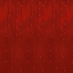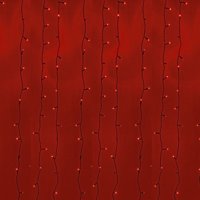 Гирлянда "Светодиодный Дождь", от Neon Night, типа "Занавес", серии Original, с чёрным проводом из ПВХ. Данная гирлянда имеет красный цвет свечения светодиодов. Представляет собой гибкий горизонтальный шнур-шину (2м), к которому через определенные промежутки крепятся вертикальные нити (20шт.) со светодиодами, которые отличаются от «Бахромы» тем, что имеют одинаковую, достаточно значительную длину, часто превышающую протяженность шины. На концах каждой шины есть разъем и штепсель, которые предназначены для последовательного соединения нескольких световых дождей в большой занавес ПЛЕЙ-ЛАЙТ