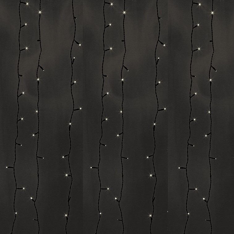 Гирлянда "Светодиодный Дождь", от Neon Night, типа "Занавес", серии Original, с прозрачным проводом из ПВХ. Данная гирлянда имеет тёплый белый цвет свечения светодиодов. Представляет собой гибкий горизонтальный шнур-шину (2м), к которому через определенные промежутки крепятся вертикальные нити (20шт.) со светодиодами, которые отличаются от «Бахромы» тем, что имеют одинаковую, достаточно значительную длину, часто превышающую протяженность шины. На концах каждой шины есть разъем и штепсель, которые предназначены для последовательного соединения нескольких световых дождей в большой занавес ПЛЕЙ-ЛАЙТ