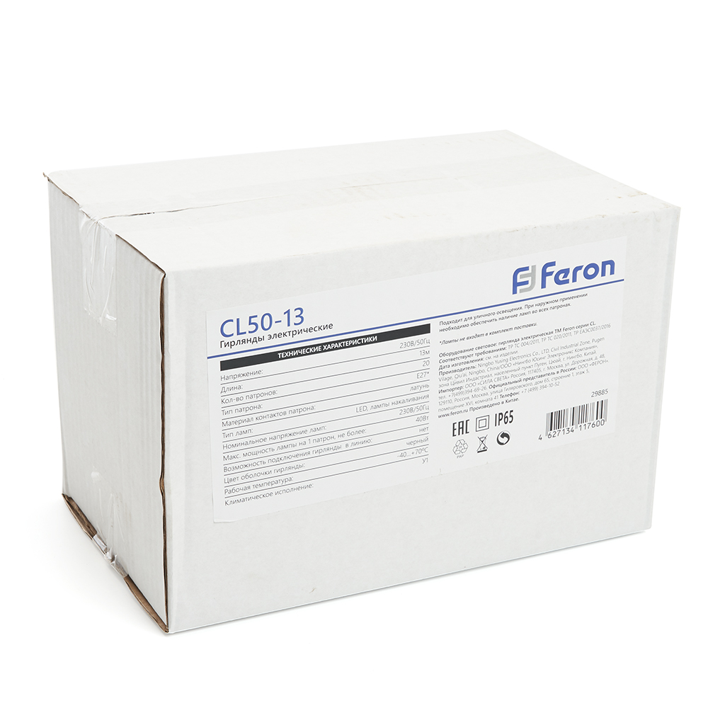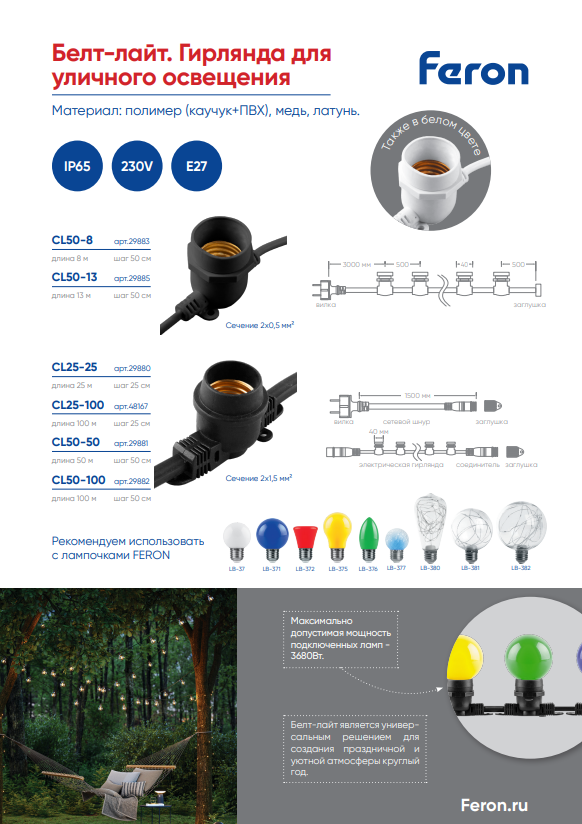 Светильник гирлянда белт-лайт для уличного освещения Feron 29885 CL50-13, 10м+3м сетевой шнур, 20xЕ27, макс. 80Вт, 230В, IP65, 2x0.5мм2, черный