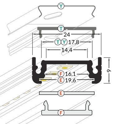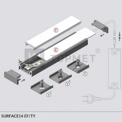 Накладной LED профиль Topmet SURFACE 14 EF/TY отличается возможностью скрытого монтажа и широким ассортиментом представленных цветов. Предназначен для светодиодных лент шириной до 14 мм. Сечение - 24х9 мм.