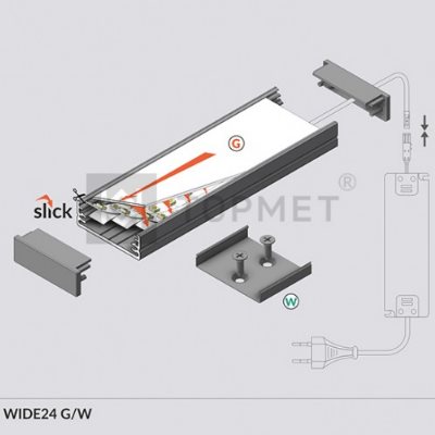 Декоративный накладной светотехнический LED профиль Topmet WIDE24 G/W отличается большой шириной, обеспечивающей возможность монтажа светодиодных лент шириной до 24 мм. Характеризуется широким ассортиментом представленных цветов и аксессуаров. Сечение - 32х11 мм.