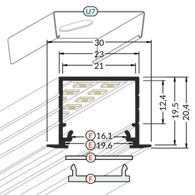 Встраиваемый LED профиль Topmet LINEA-IN20 EF/U7 имеет усеченную высоту. Преимущественно предназначен для установки в уже имеющиеся прорезанные пазы в потолках и стенах, но может быть использован и в иных конструкциях. Предназначен для светодиодных лент шириной до 20 мм. Сечение - 20х20 мм.