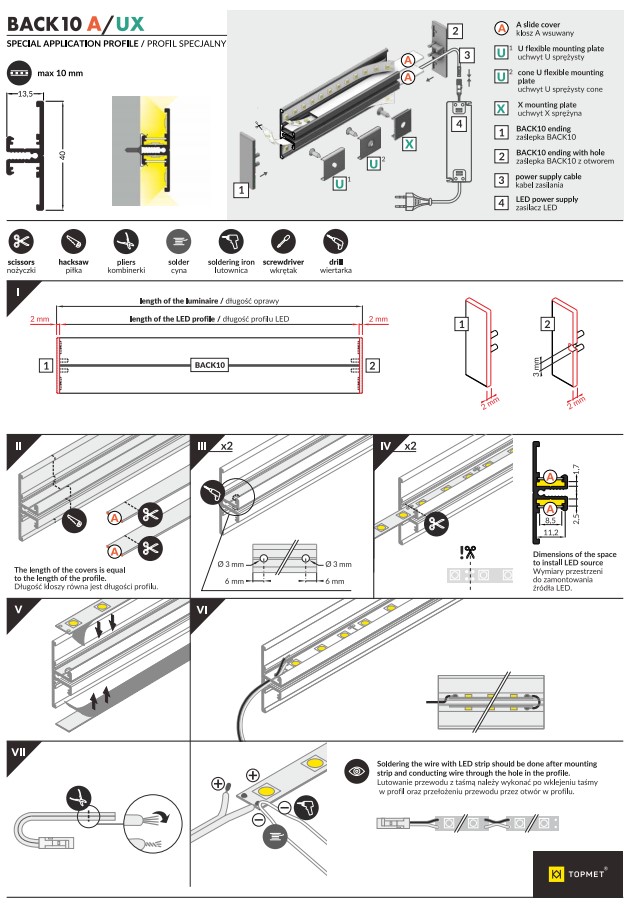 Комплект алюминиевого профиля Topmet BACK10. Характеризуется возможностью встройки множества светодиодных лент и направленностью света в несколько сторон. Специальный светодиодный профиль BACK10 отличается нестандартной конструкцией, он применяется в ситуациях, когда не один из стандартных профилей применить нельзя. T-образная форма профиля позволяет организовать световой поток по двум направлениям. Используется для четырех светодиодных лент шириной до 10 мм (каждая). Выполнен из анодированного алюминия. Длина собранного комплекта профиля - 1 метр.