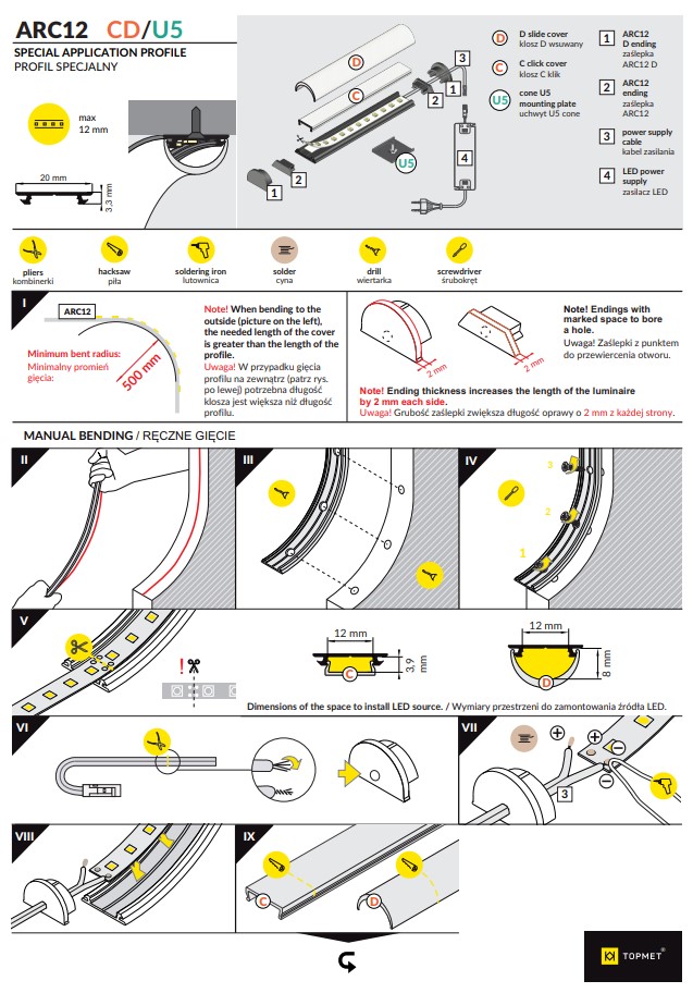 Комплект алюминиевого профиля Topmet ARC12. Характеризуется гнущейся конструкцией. Специальный светодиодный профиль ARC12 отличается нестандартной конструкцией, он применяется в ситуациях, когда не один из стандартных профилей применить нельзя. Используется для светодиодных лент шириной до 12 мм. Выполнен из анодированного алюминия. Длина собранного комплекта профиля - 1 метр.