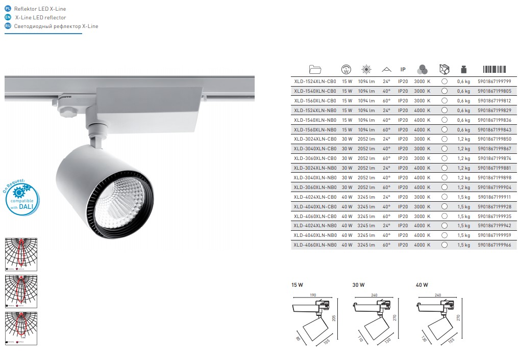Светодиодный трековый светильник GTV X-LINE, предназначенный для установки на шинопровод. Светильник выполнен в корпусе из алюминия в белом цвете. • Цветовая температура: 3000K (тёплый белый) • Световой поток: 2052Лм (источник света на 30Вт) • Угол рассеивания света: 60°