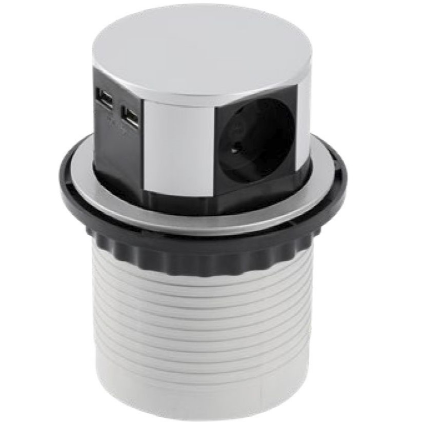 Удлинитель встраиваемый в стол GTV AE-BPW3S100U-53 COMFORT, 3xSCHUKO, 2xUSB 5V/2.4A, корпус из серебряного алюминия и черной пластмассы, кабель 1.5м