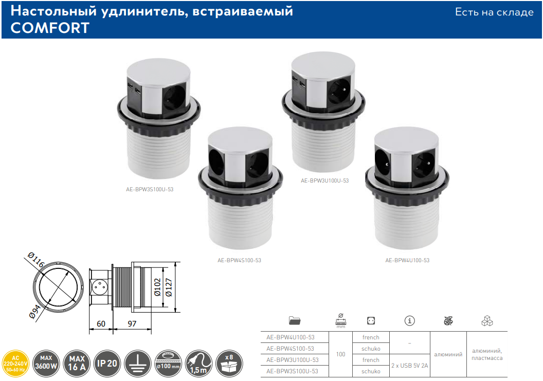 GTV AE-BPW3S100U-53встраиваемый настольный удлинитель. Выполнен в корпусе из серебряного алюминия и черной пластмассы. В корпус встроены 3 гнезда SHUKO и 2 USB-порта (5V/2.4A).